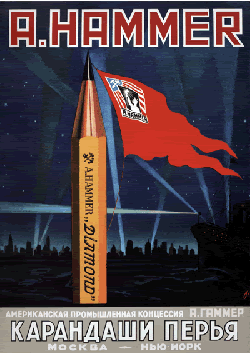 ![]() Note the canton of the flag in the ad. It is an amalgam of the Amercian flag, with the Statue of Liberty, charged with a hammer and another unrecognizable tool. Armand Hammer was an American industrialist who initiated trade with the new Soviet regime in Russia. His family owns the Church & Dwight Co., Inc. who produces Arm and Hammer Baking Soda, among other products. ![]() |